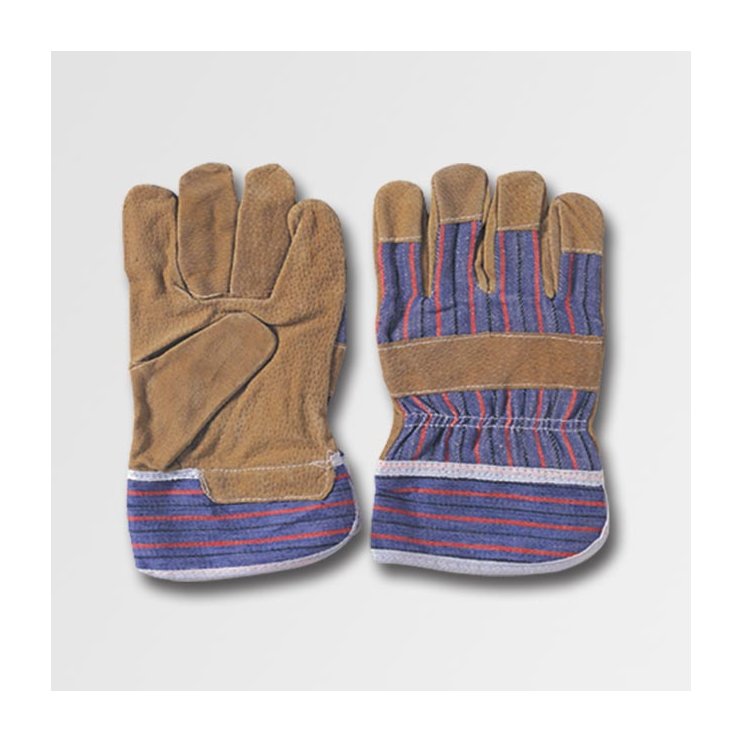 Kombinované rukavice, dlaň ze žluté vepřové štípenky, hřbet a manžeta z pruhované bavlněné tkaniny, podšívka ve dlani. více